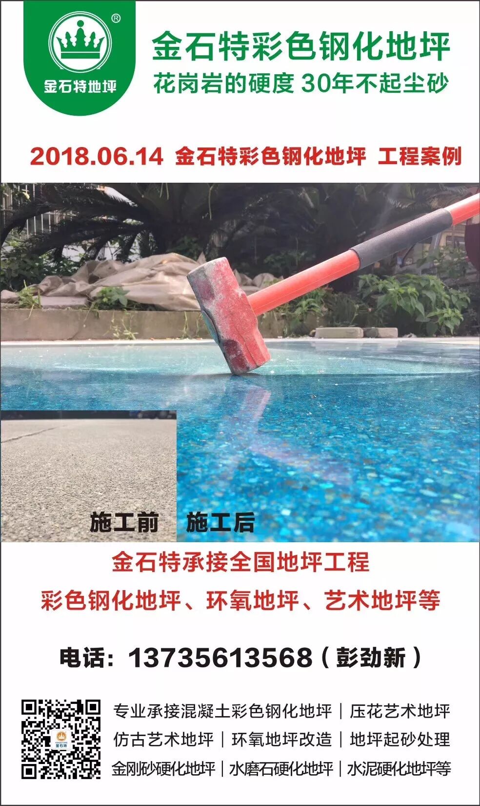 金石特混凝土锂基固化剂,可以接受莫氏硬度8级等同花岗岩的硬度考验,而彩色着色剂,更是全国首屈一指!不但颜色非常靓丽,而且上色均匀、不退色,采用进口原料,质量非常棒,口碑非常好!!
